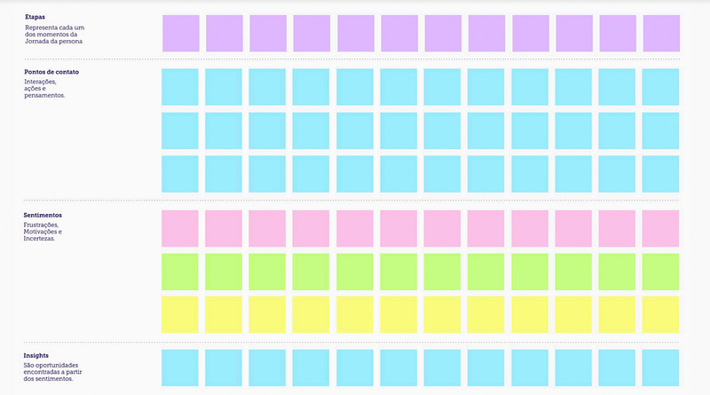 - Etapas: passos ou momentos da pessoa usuária durante toda a jornada